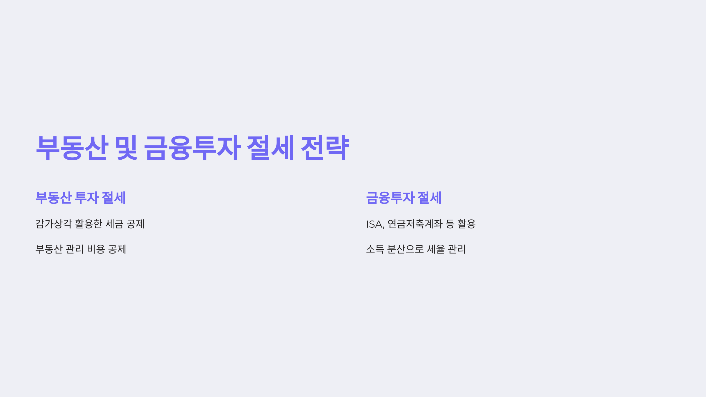 부동산 투자의 가장 큰 세금 혜택은 감가상각입니다. 건물 부분의 가치가 시간이 지날수록 감소한다고 보고 합법적으로 세금을 공제받을 수 있습니다. 이는 실질적인 현금 흐름에는 영향을 주지 않으면서도 세금 부담을 크게 줄일 수 있는 방법입니다.