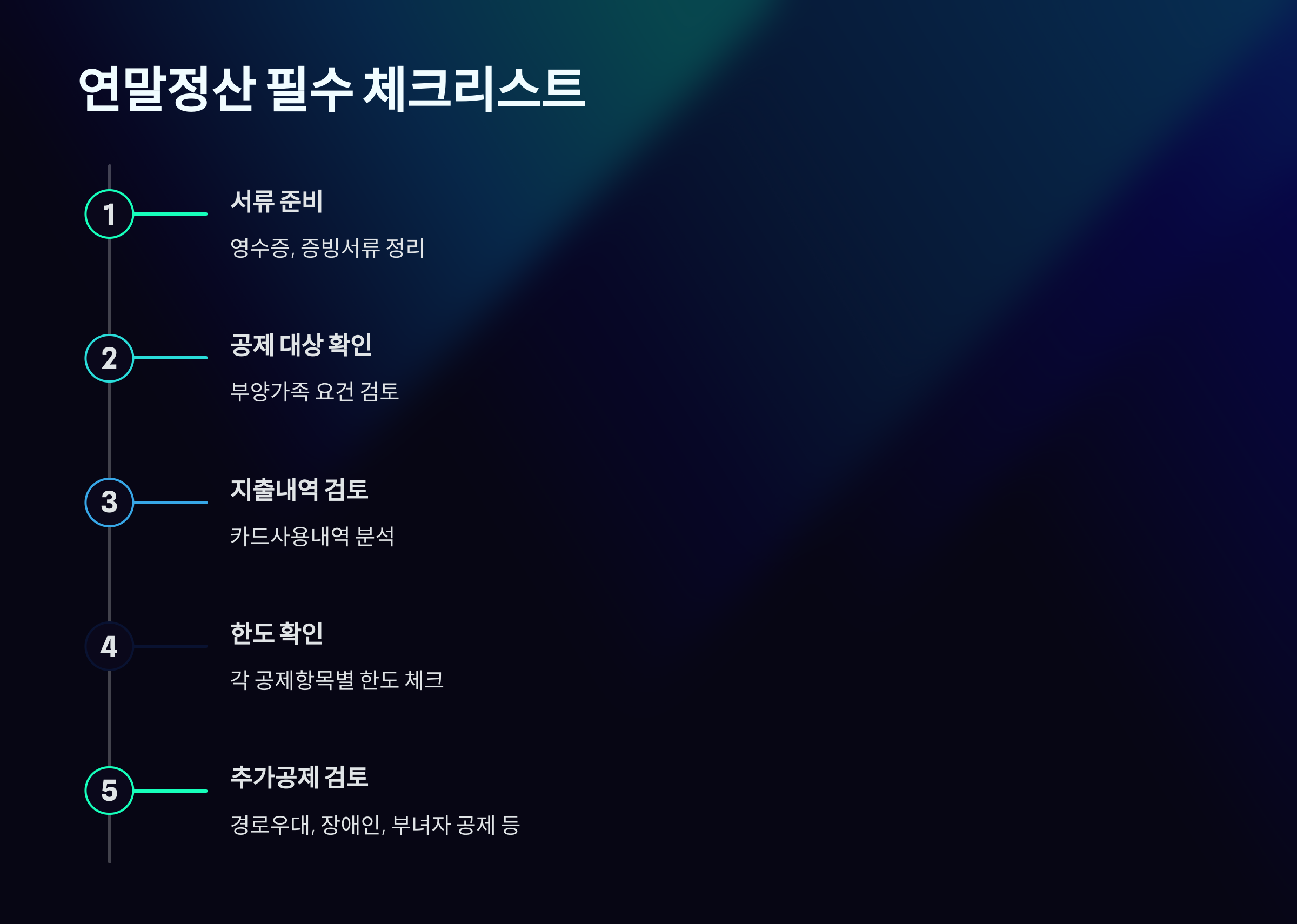 - 세액공제 확인: 의료비, 교육비, 기부금 등 공제항목 정리
