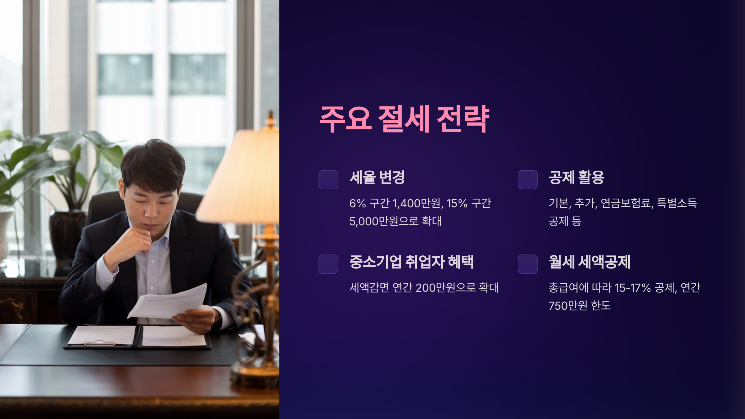 중소기업 근로자의 소득세 감면 혜택이 연간 150만원에서 200만원으로 확대되었습니다. 청년(만 15~34세)의 경우 근로소득세의 90%까지, 그 외 취업자는 70%까지 감면받을 수 있습니다.