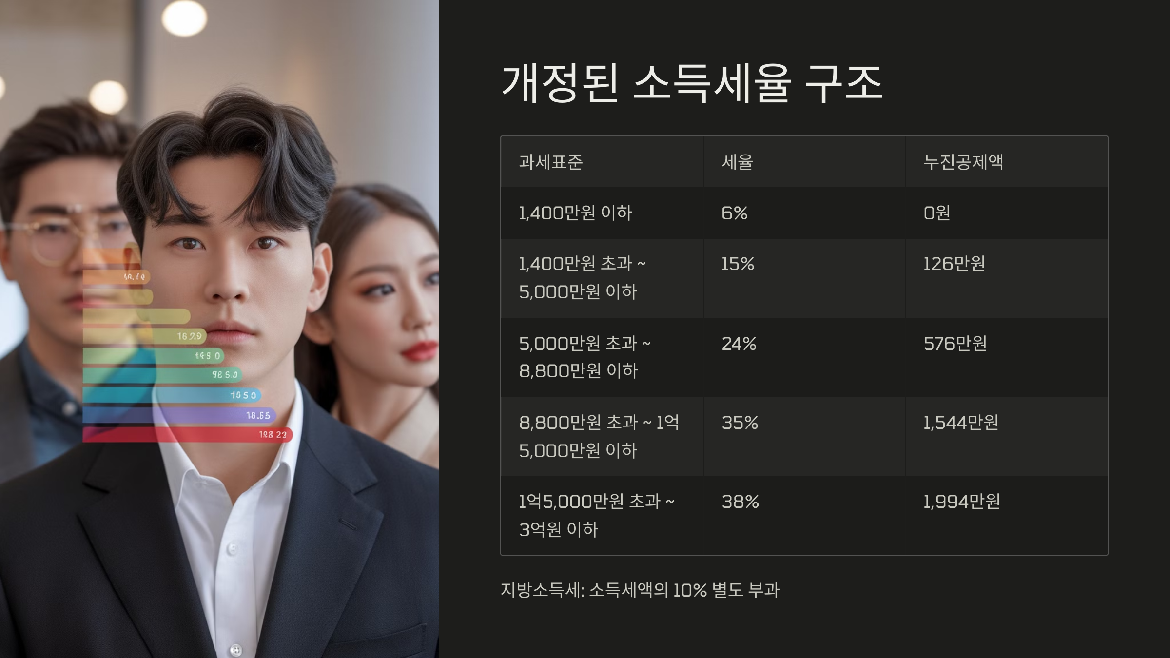2024년부터 근로소득세 세율 체계가 크게 변경되었습니다. 6% 세율이 적용되는 과세표준 구간이 1,200만원에서 1,400만원으로 상향되었으며, 15% 세율 적용 구간도 4,600만원에서 5,000만원으로 확대되었습니다.