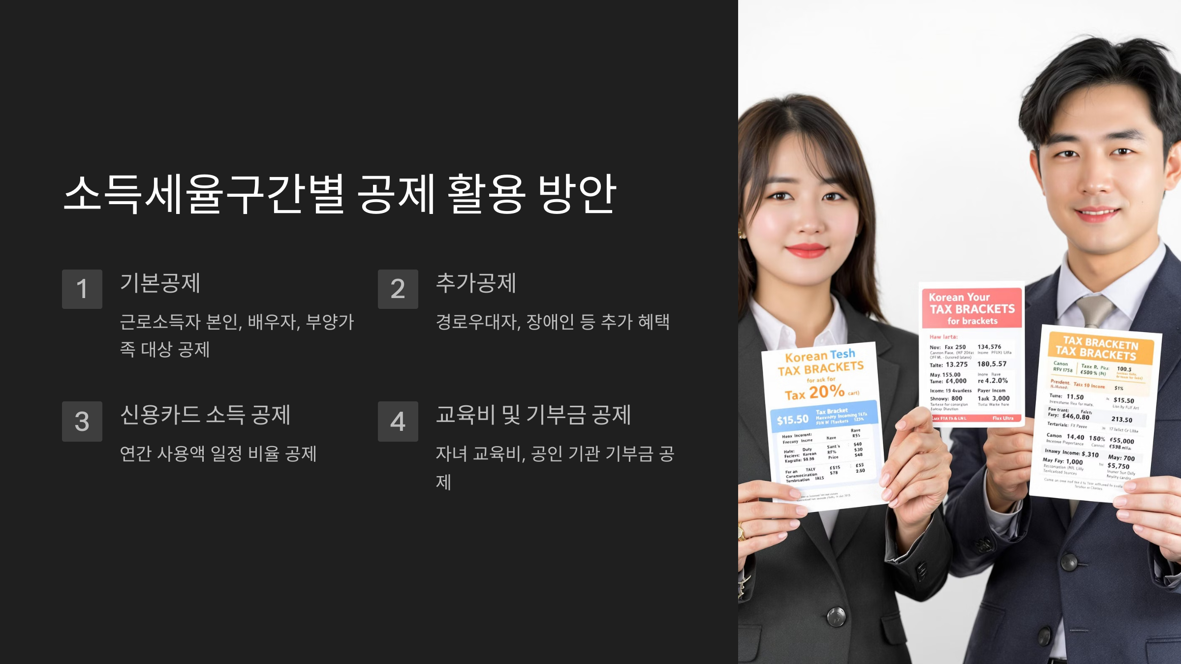 각 소득세율구간에 따라 적용되는 공제 전략이 달라져야 최적의 절세 효과를 얻을 수 있습니다. 높은 세율구간에서는 소득을 줄이는 공제 전략을, 낮은 세율구간에서는 과세구간을 최대한 활용하는 전략을 사용해야 합니다.