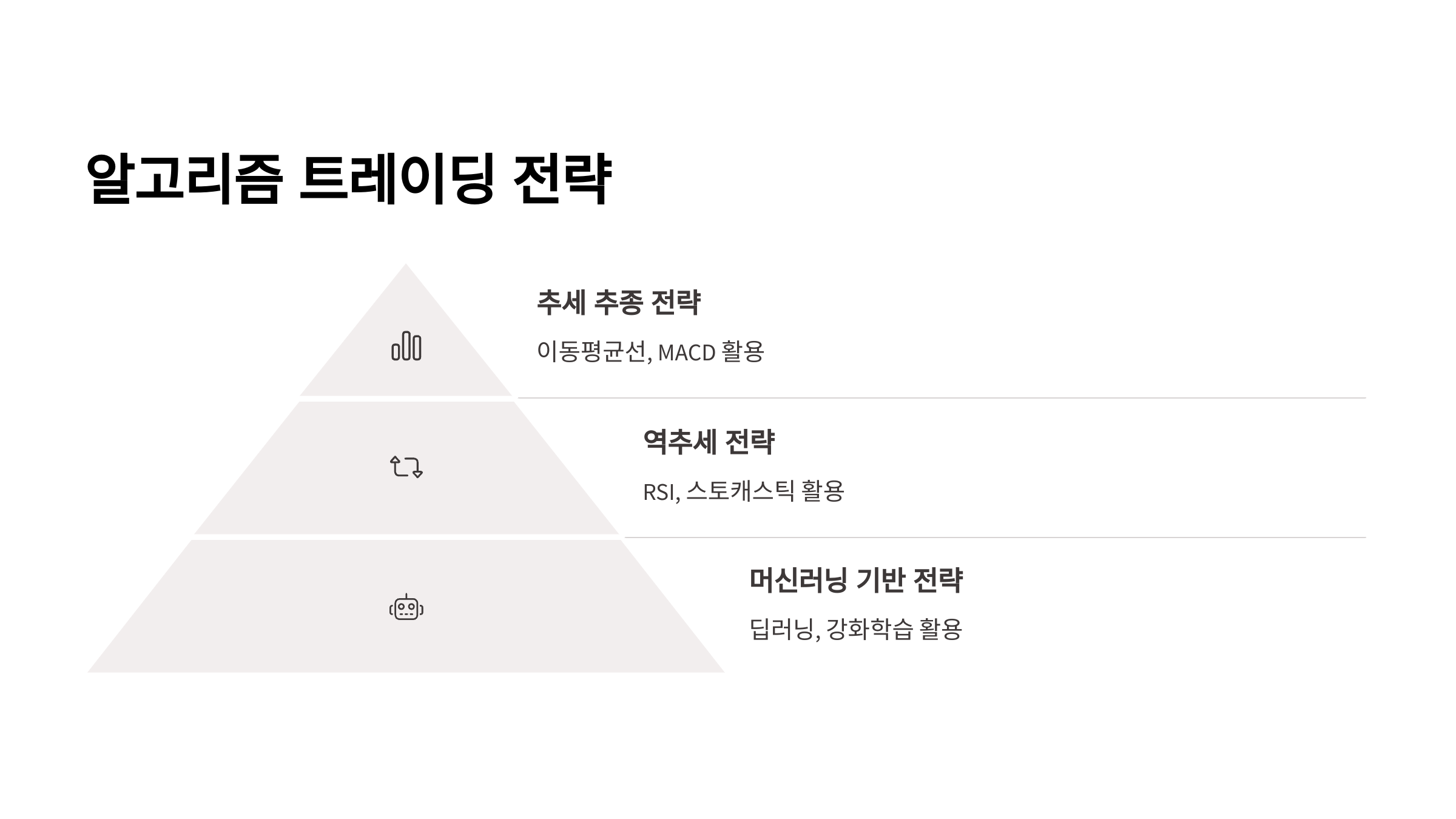 - 머신러닝 기반 전략: 과거 데이터를 기반으로 미래 가격을 예측하는 전략입니다. 딥러닝, 강화학습 등의 기술을 활용하여 복잡한 패턴을 분석합니다.